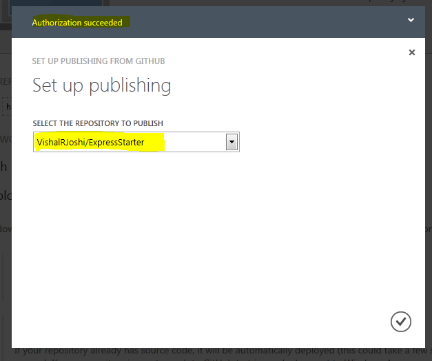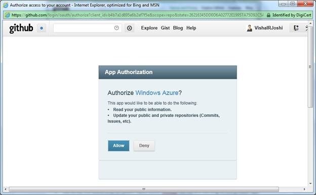 Clicking the “Authorize Windows Azure” to your Github repository will launch a wizard which will set up service hook in Github. Let us follow the Wizard.
