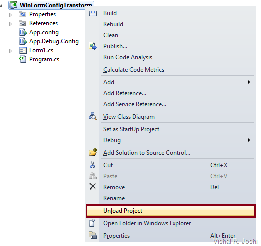 Step 5 Save the edited files and unload the project frin VS 2010 Solution Explorer using the right click command as shown below: